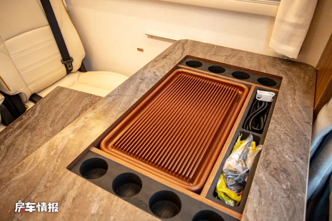 会客区则是采用了双人乘用车级别的座椅+大尺寸的升降餐桌,这样乘坐的时候也能够调节靠背角度,,而这张外观看似普通的餐桌,台面下却藏着一个茶水台,当驻车之后,在这里饮茶谈心,也是一种很惬意的感受。