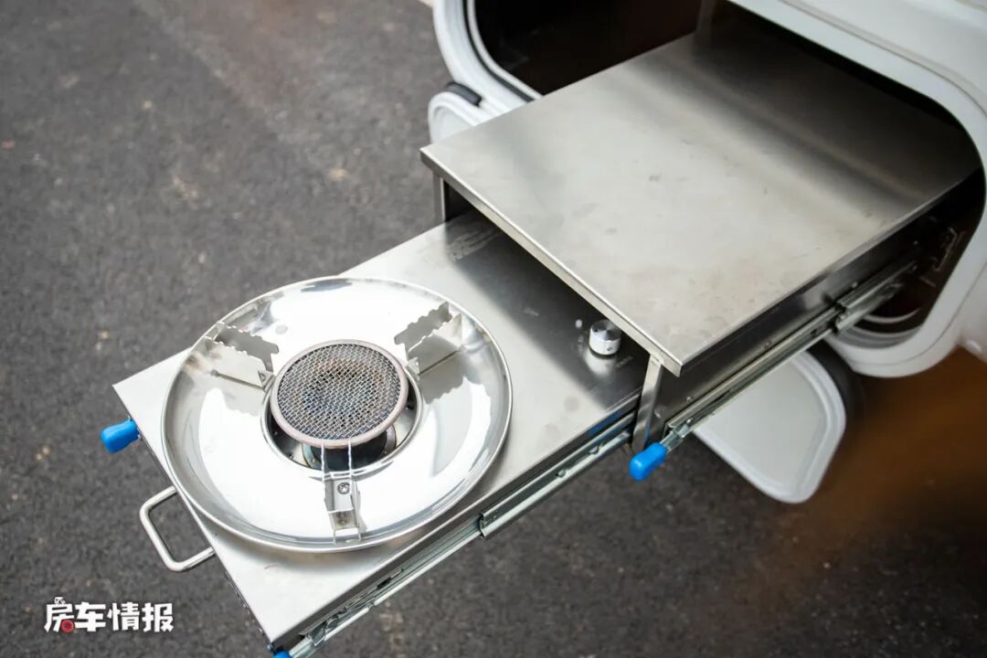 除了别有用心的水电路设计,这款车的外部配置也很丰富,带有遮阳棚、外置抽拉燃油灶、外置翻板、外置淋浴花洒以及超大尺寸的储物舱等,可以满足日常在户外使用的需求。