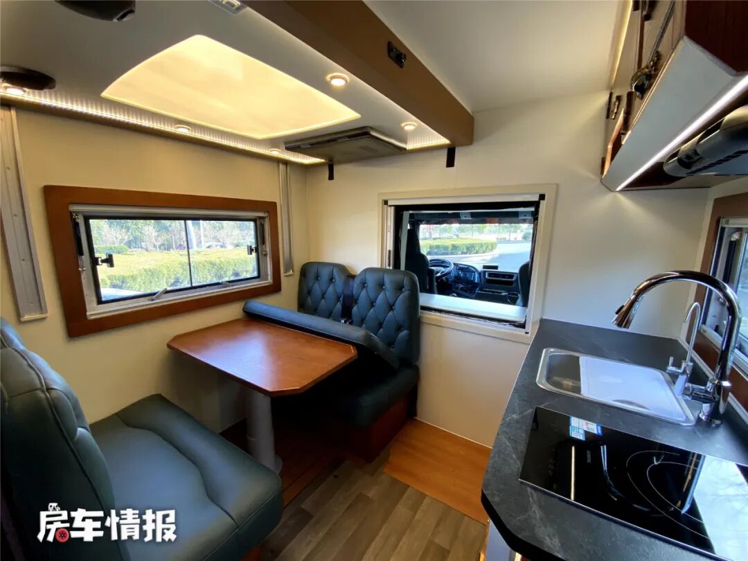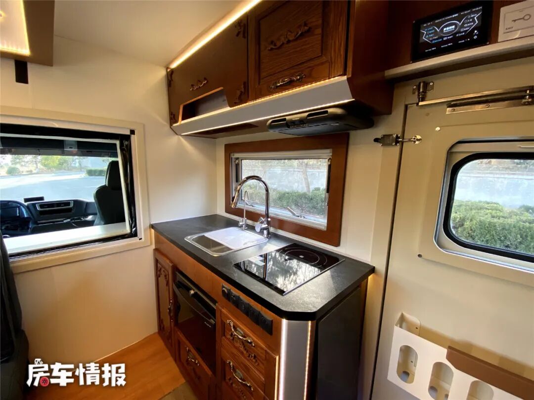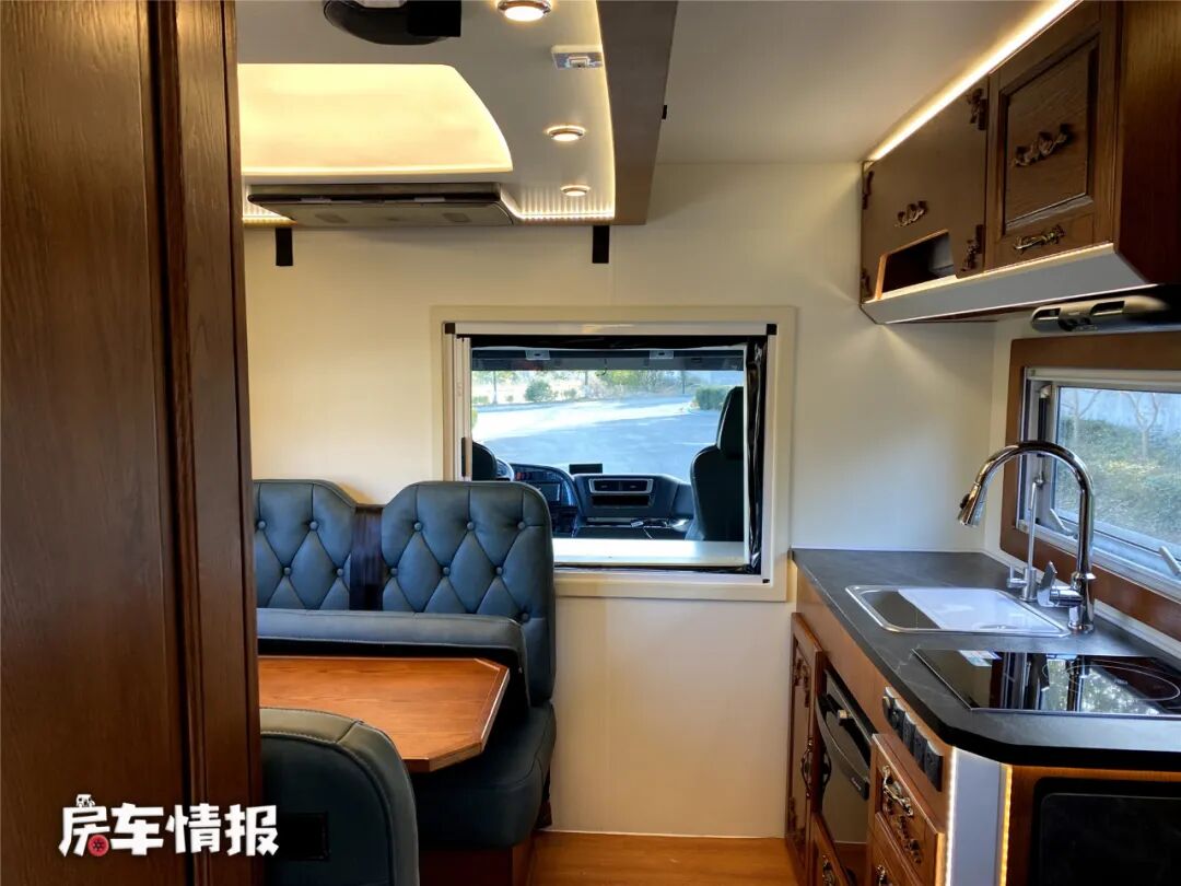 进入车厢内生活区,可以看到布局不是那么紧凑了,由前到后依次为会客区、厨房区、卫生间和上下层的母子床,搭配红橡木家具和深色用品,给人一种华贵之感。