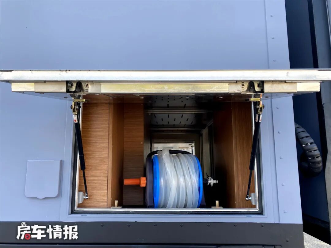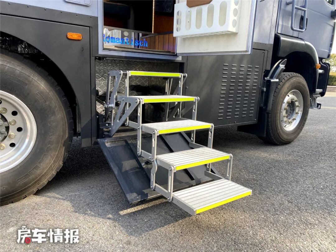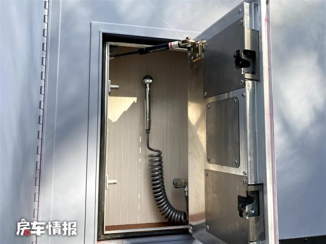 车身外侧还有多个其它设施,如外詈花洒、贯通式储物舱、外接电源接口等,让户外生活变得更加充实。由于本车车身较高,从中门进入生活区需要上五级电动折叠台阶,之后,车门旁的小盒子里还有个密码锁,让车内生活更加安全。