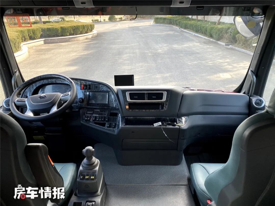 驾驶室内同样采用深色系颜色,驾驶员一侧搭配了大理石花纹,让车内看上去也很稳重,采用多功能方向盘、多媒体车机,让驾驶更加方便。由于车型宽大,本车将驾驶员所需使用的按键都集中在了驾驶员一侧,方便驾驶员使用。