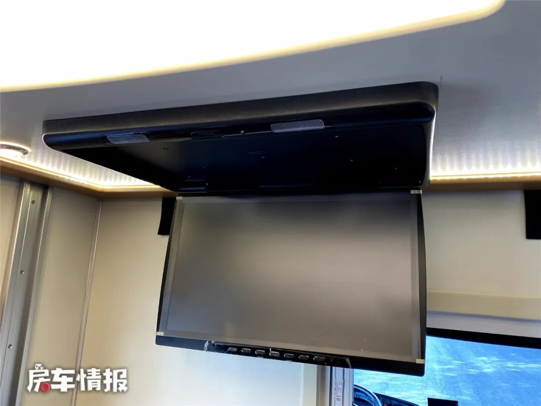 当睡眠空间不足时,会客区顶部还有一张尺寸为1800*1250mm的电动升降单人床,睡下一名成年人也是没有问题的。出于安全考虑,小孩子暂时不要睡在上面了。