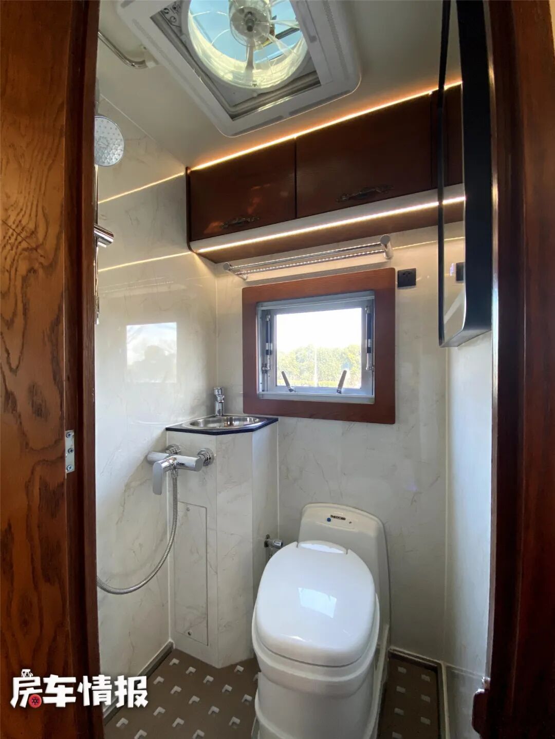 卫生间内的空间很大,站下两名成年人也是不成问题的,内部装有不锈钢洗手盆、马桶、淋浴喷头、镜子、换气扇、储物柜等设施,在户外也能随时保持个人清洁。