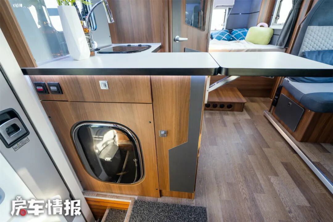 位于橱柜的外侧还提供了一台3kg洗烘一体机,便于在长途旅行中清洗衣物,这也是现在越来越多车友比较看重的设备之一。