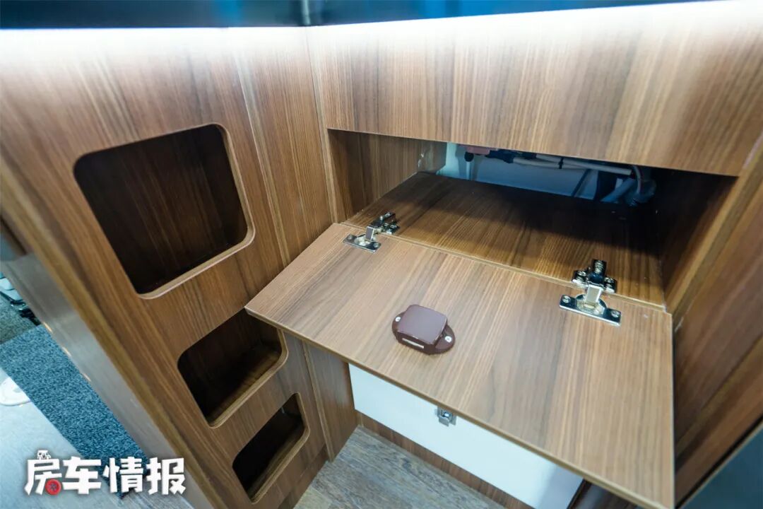 另外车内也提供了多个隐藏式储物空间,如顶部吊柜、尾床底部储物柜、沙发座椅下方储物柜等,可以存放下旅行中的必需品。