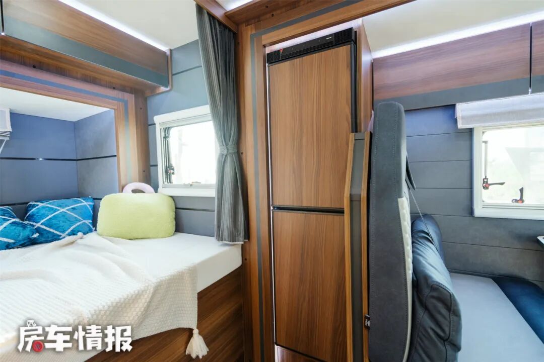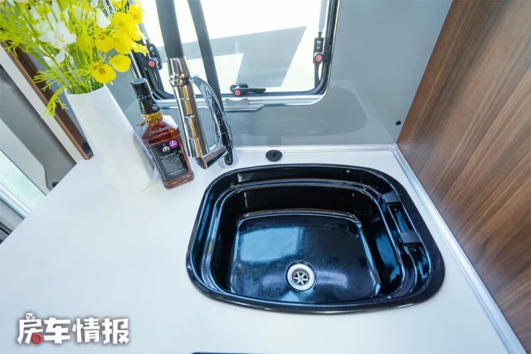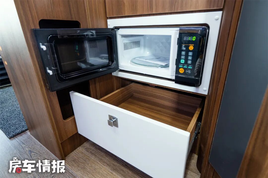 由于车外提供了柴油灶,车内的厨房可以作为补充使用,提供了洗菜池、微波炉、152L房车专用冰箱等,基本上可以解决一家人出行的吃饭问题。