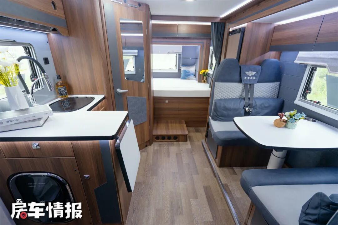 进入生活区,得益于车身采用的双拓展布局,内部的活动空间还是挺可观的,基本上一家4-6口人在车内休息不会感到过于拥挤,另外车内采用的这种深色家具搭配该品牌特有的深灰配色,让整个生活区看起来还挺贵气的~