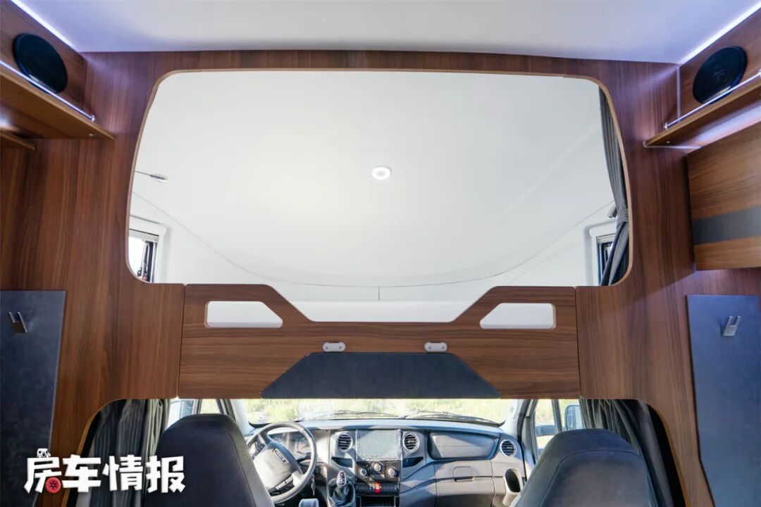 位于驾驶室顶部的额头内也提供了一张大尺寸双人床,得益于弧线型的车顶造型,额头床垂直空闲表现也挺不错,同样可以睡下两名成年人,掀起床板后下方液晶电视,便于在旅行中观看电视节目。
