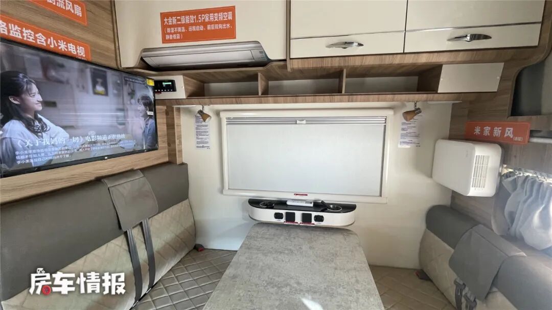 会客区由一张餐桌、双人对卡座沙发组成,侧面装有1.5P家用变频空调、卧室客厅循环倒流风扇,桌面上装有220V插座、USB接口,方便就坐时使用,而且有了插座,吃火锅也不成问题。还可以选装米家新风系统和小米电视,方便大家的户外生活。