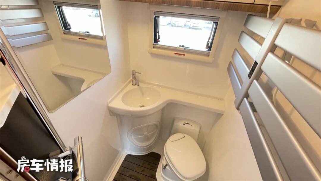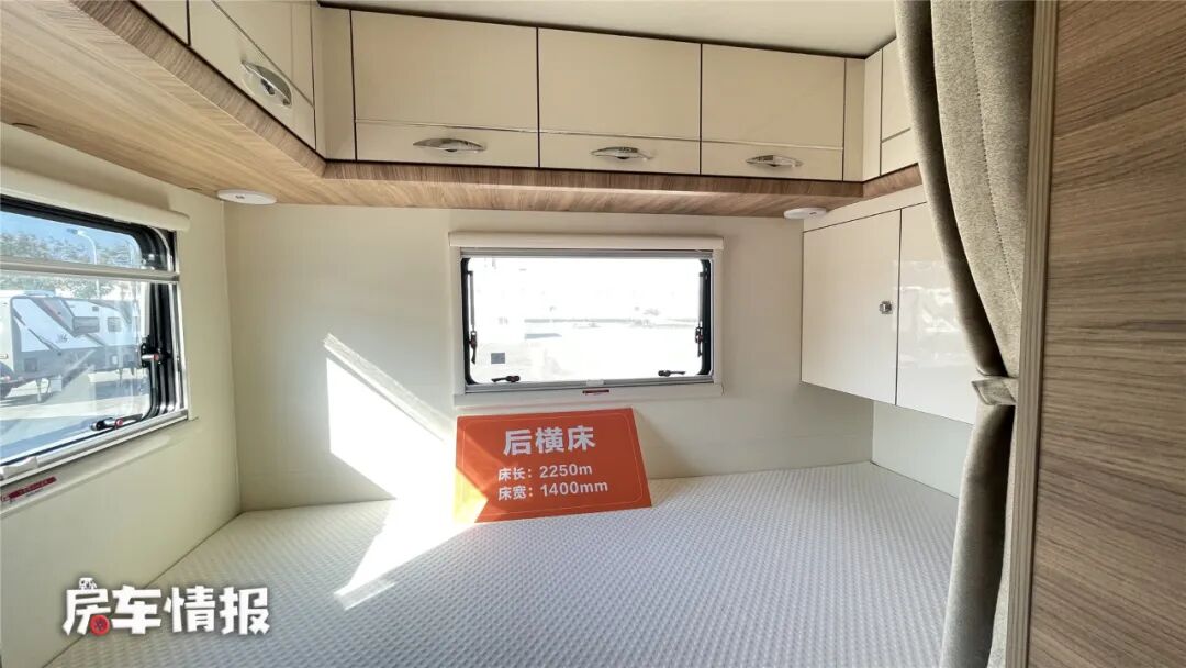 车尾的后横床尺寸为2250*1400mm,不仅空间大,周围还装有多个储物柜,可以放置很多出行的衣物和被褥,两侧还有外推窗,可以为车内通风、增加光照,和车内连接处还有隐私帘遮挡,可以保护休息时的隐私。床下还装有一个3KG的洗烘一体机,让大家在户外也能随时穿到干净的衣物。