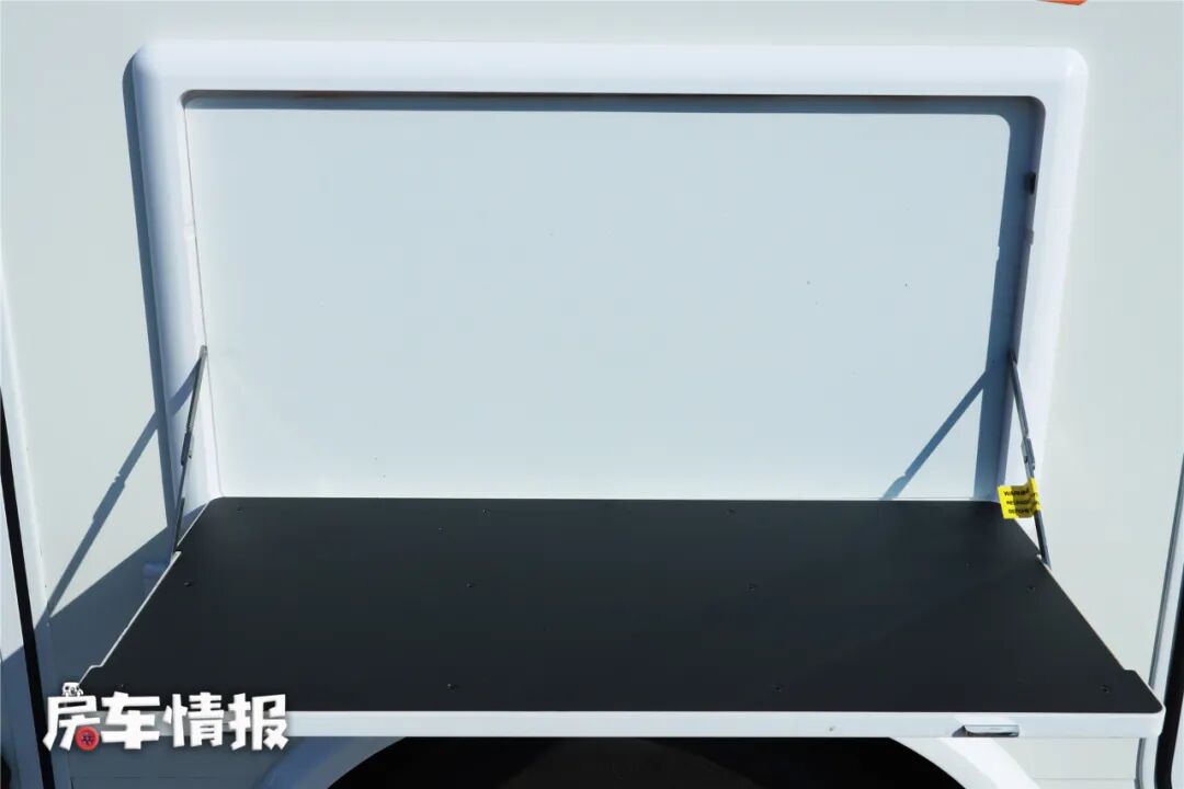 外观上,车身大面积为白色,配有灰色和黄色的拉花装饰,让车身不再单调,更有辨识度。外部使用免漆彩铝板,额头材料为FRP,更加环保耐用,车外装有市电接口、重力注水口、手动驻车支腿、带有灯带的4米遮阳棚、户外喷头、外接水口、户外车板、储物舱等设备,让户外生活多姿多彩。