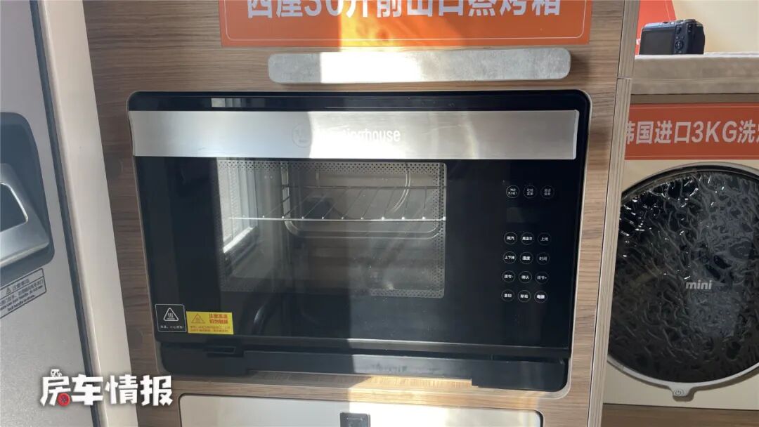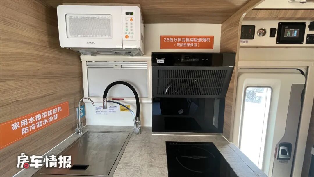 厨房区域装有带盖板的水槽、200W电磁炉、25档分体式集成吸油烟机、微波炉、蒸烤一体机、224L直流冰箱、烟雾报警器,还有多个储物柜,让大家在户外也能享受到更多的美味。