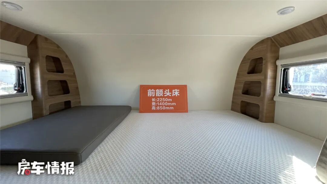 额头床内空间尺寸为2250*1400*850mm,两名成年人睡下也不会觉得拥挤,两侧还有外推窗,车顶装有小圆灯,可以很好地为车内提供光照,同时还有小的置物柜,放置小物件是没有问题的。