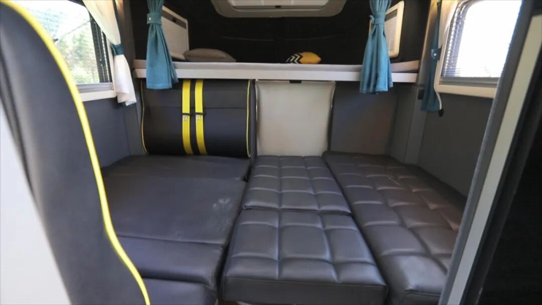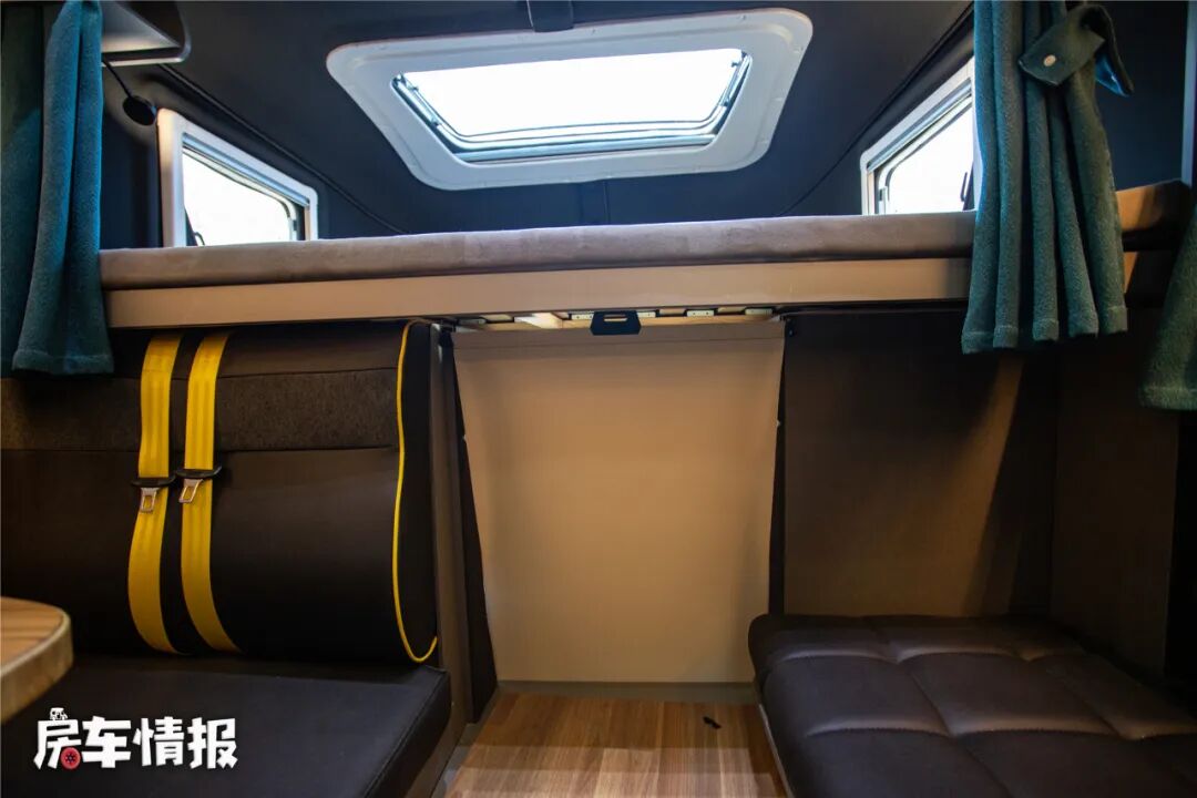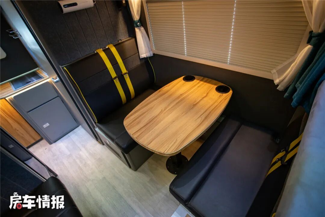 四人对卡座的舒适性也很不错,腿部空间充裕、坐垫软硬适中,另外黄色的安全带看起来也挺年轻运动,普通桌板也可选装小茶台。另一侧条形沙发,在行车时不可乘坐,只有驻车以后才能使用,舒适性同样不差。