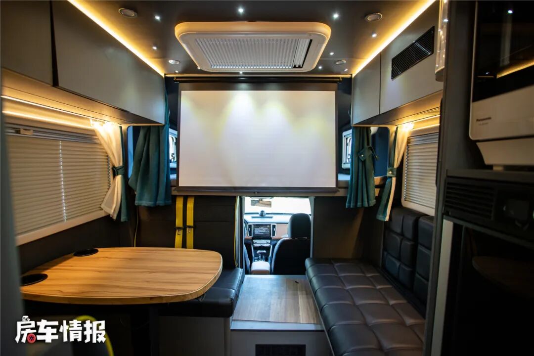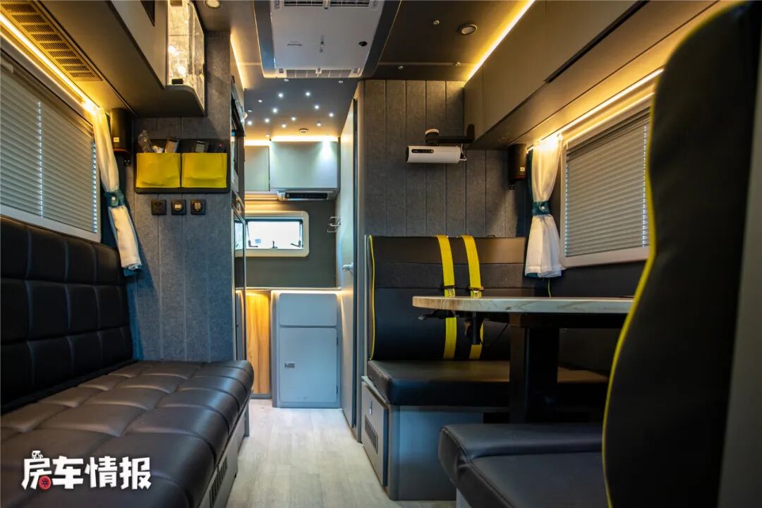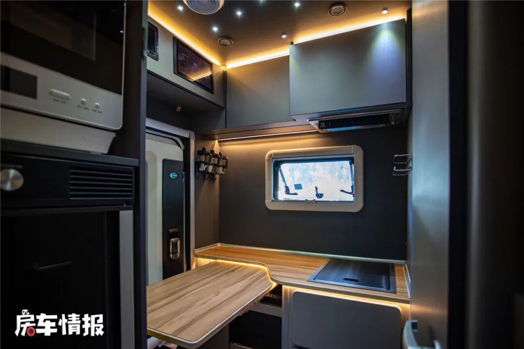 进入生活区,又是给了我不小的惊喜,整车采用深色家具搭配之前出现在升顶炮上的星空顶,立马让车内具有了豪华包厢的既视感,当然如果不喜欢深色内饰,后期也可以根据自己的喜好选择其他颜色,这就是定制款车型的便利之处~不过话说回来,对于这套黑色内饰我个人还是挺喜欢的,大家觉得如何呢?