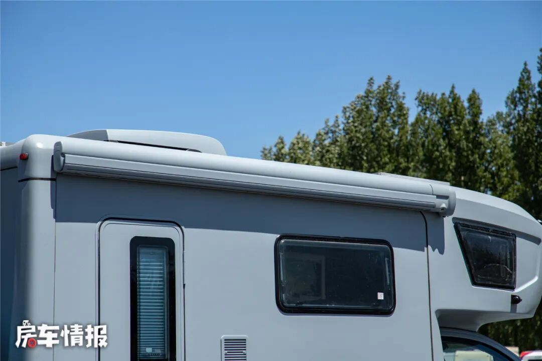 车身外部还有一个能够匹配高端定位的设施,那就是电动遮阳棚,在车内轻轻一按遮阳棚就会自动打开/收回,省心省力,在我的印象里,这应该是电动遮阳棚首次出现在国产皮卡房车上。