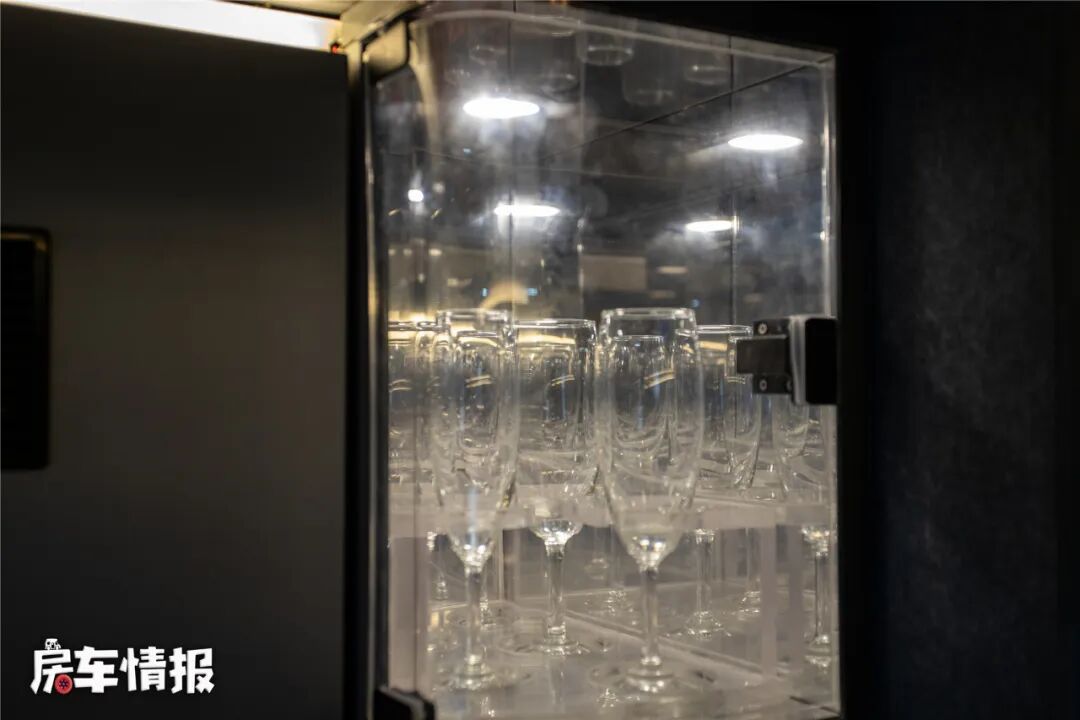 位于条形沙发上方还提供了一个小尺寸的酒柜,这样的设计更多是出现在商务车上,营造出了一定商务豪华风的氛围。