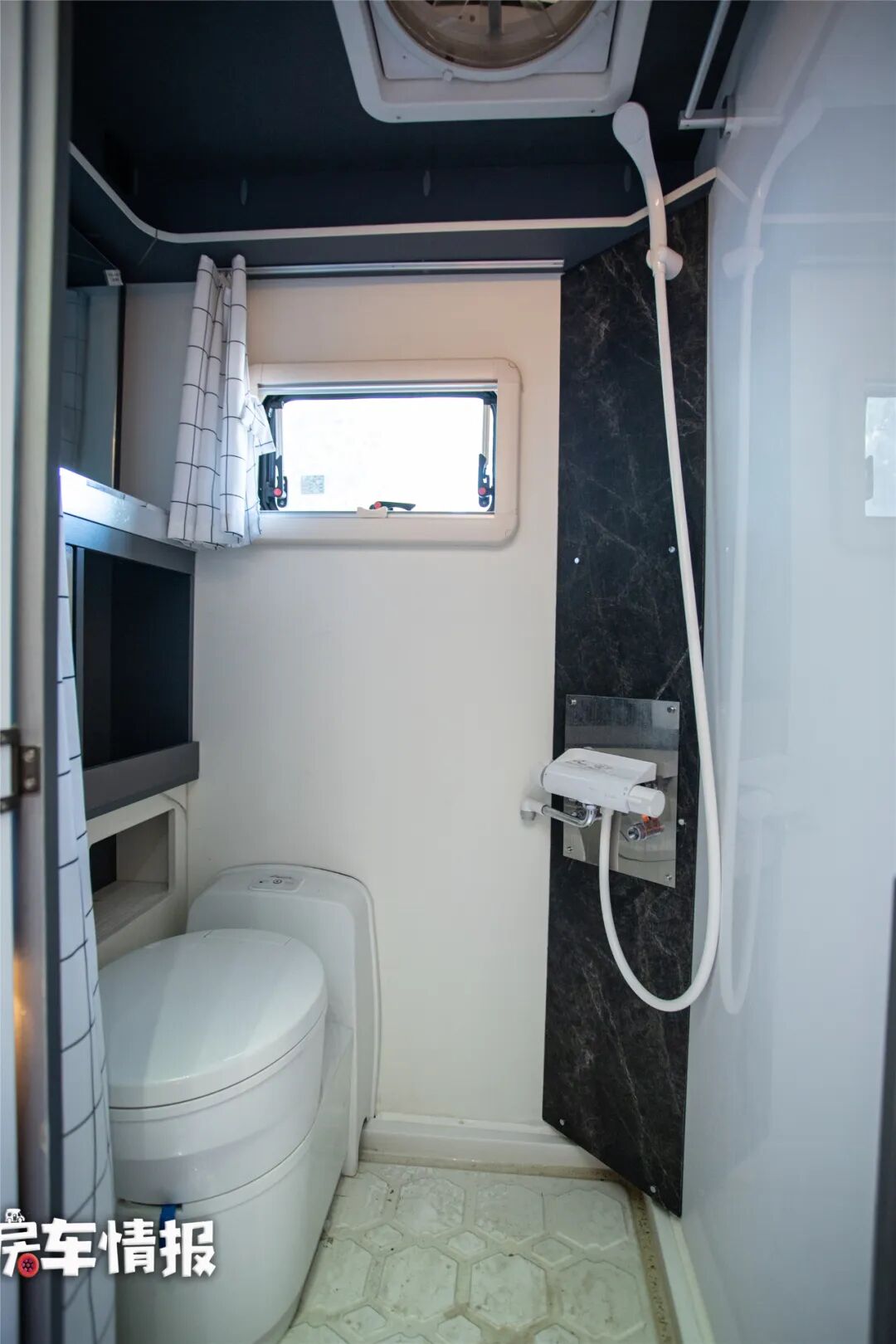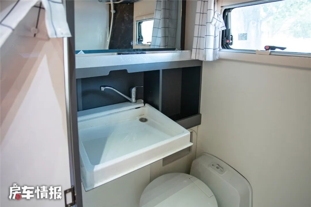 车内卫生间的空间表现也挺不错,成年人在里边可以自由转身,设备上这里提供了可旋转的盒式马桶、隐藏洗手盆、梳妆镜、独立淋浴花洒以及换气扇等,基本上可以满足日常使用。