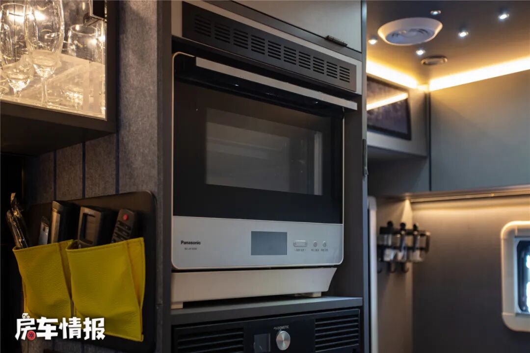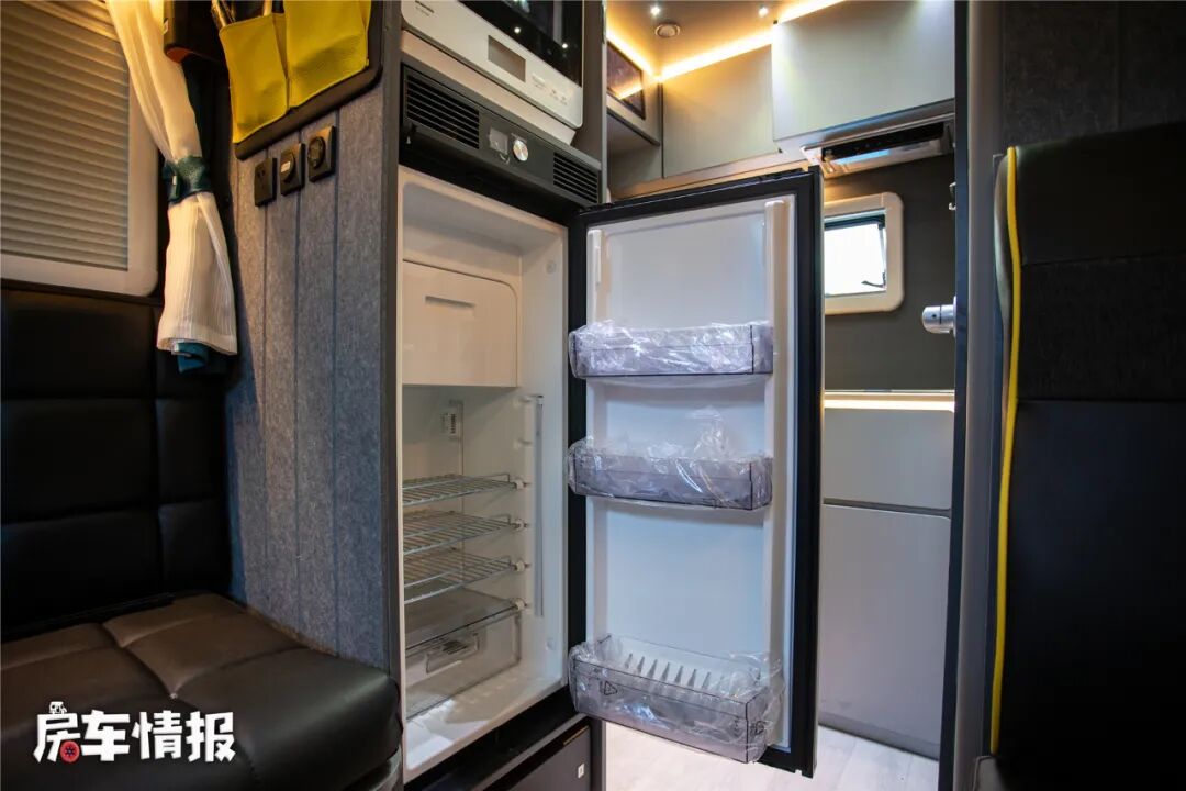 酒柜下方还提供了房车里比较少见的蒸烤一体机,这点对于比较喜欢做饭的人来说无疑多了个好帮手;车内的房车专用冰箱也比较有意思,冰箱门可以从左右两侧开启,不管是在左侧还是右侧,都能比较轻松的打开冰箱拿取物品。