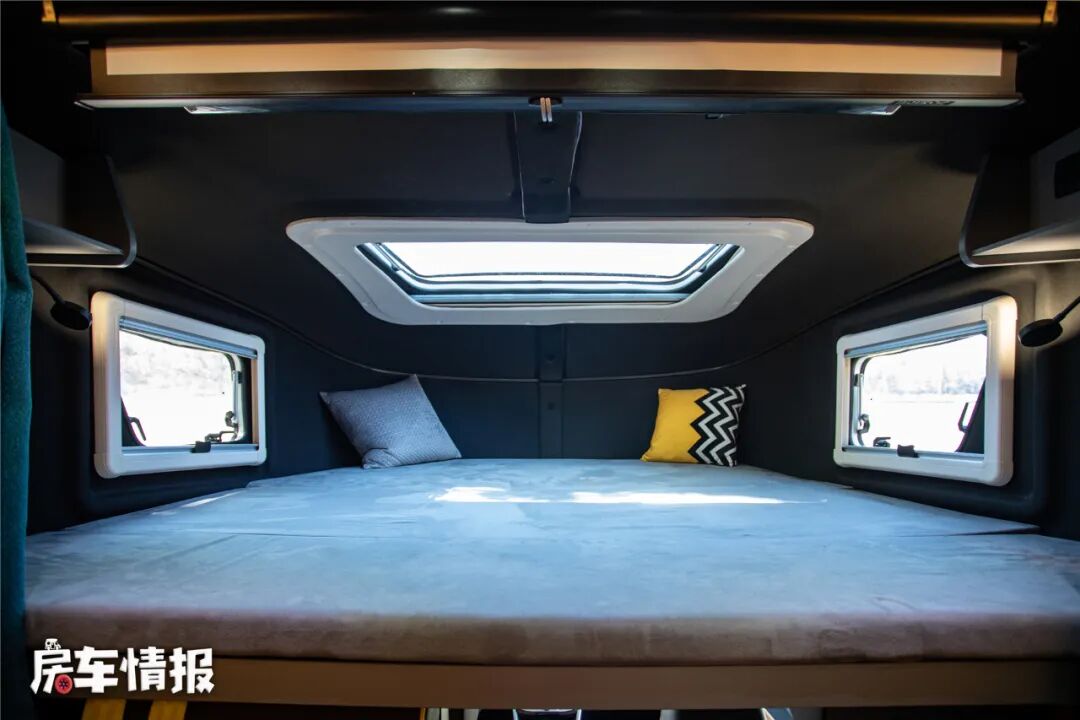 前方额头处依然是一张超大尺寸双人床,长宽分别达到了1976mm和1700mm,再加上相对平直的车顶造型,可以轻松睡下两大一小;