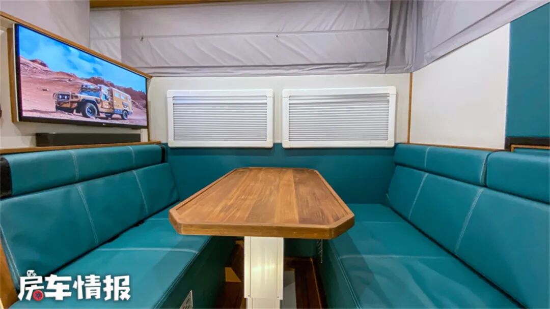 客厅由一张电动升降餐桌和豪华对座式双人沙发组成,周围装有房车专用窗户和天窗,都带有防蚊窗帘,保证了车内舒适的生活环境。