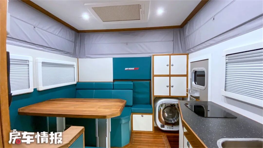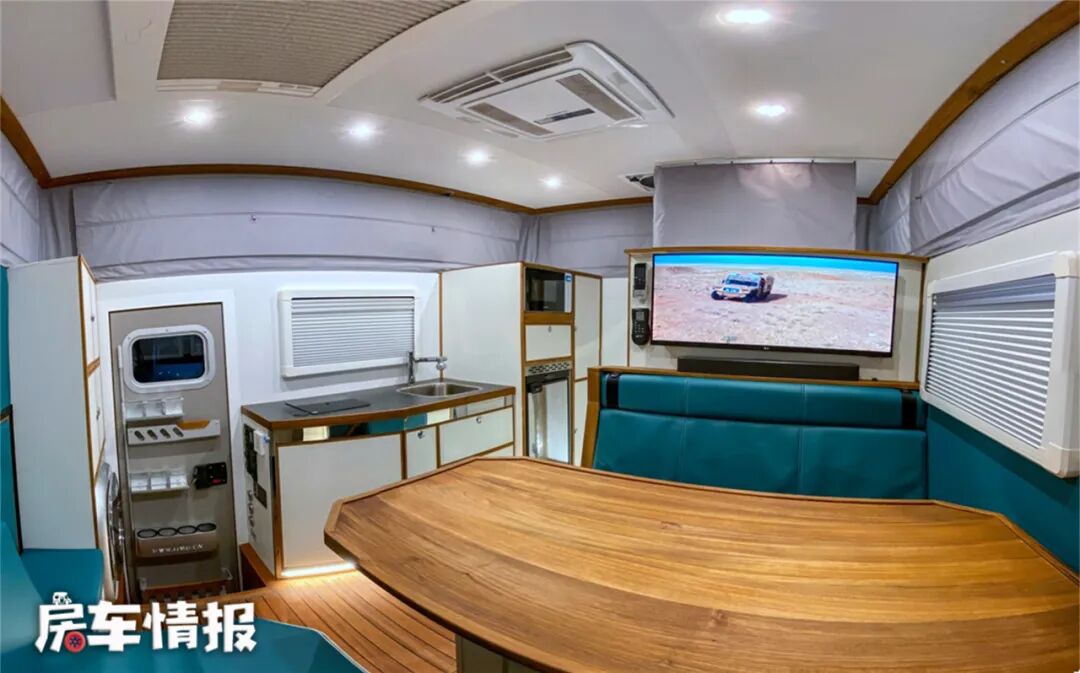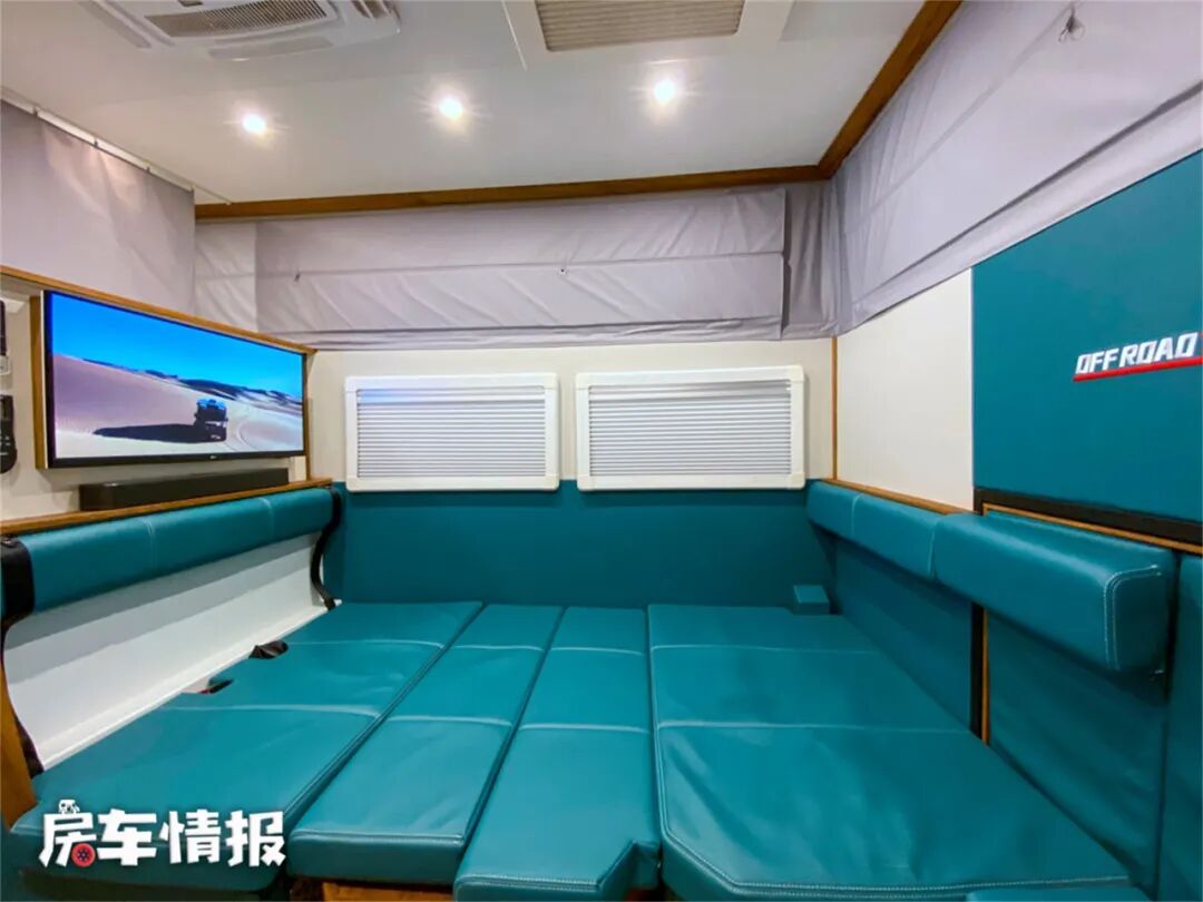 走进车内生活区,可以看到一客一厅一卫两厨以及一衣帽间的布局,而且各部分的生活设施都很齐全。还配有JBL蓝牙音箱系统、智能小米电视盒子以及LG34英寸高清带鱼屏显示器,让车内有了更多的娱乐设施,在户外玩累了,可以享受舒适的车内生活。