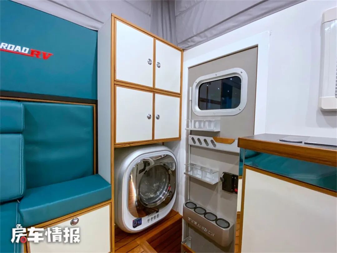 进门处装有一台韩国进口MINI洗衣机,顶部有游艇柚木面板多组合储物柜,车门处还有多个小的储物槽,方便大家存放出行物品。