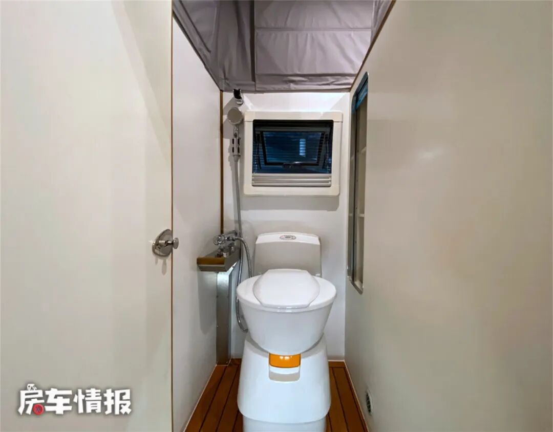 卫生间空间宽裕,使用独立式淋浴间的设计,装有换气扇、多美达旋转式马桶、一体式淋浴花洒、房车专用水盆及水龙头,完全可以满足户外的卫生需求。