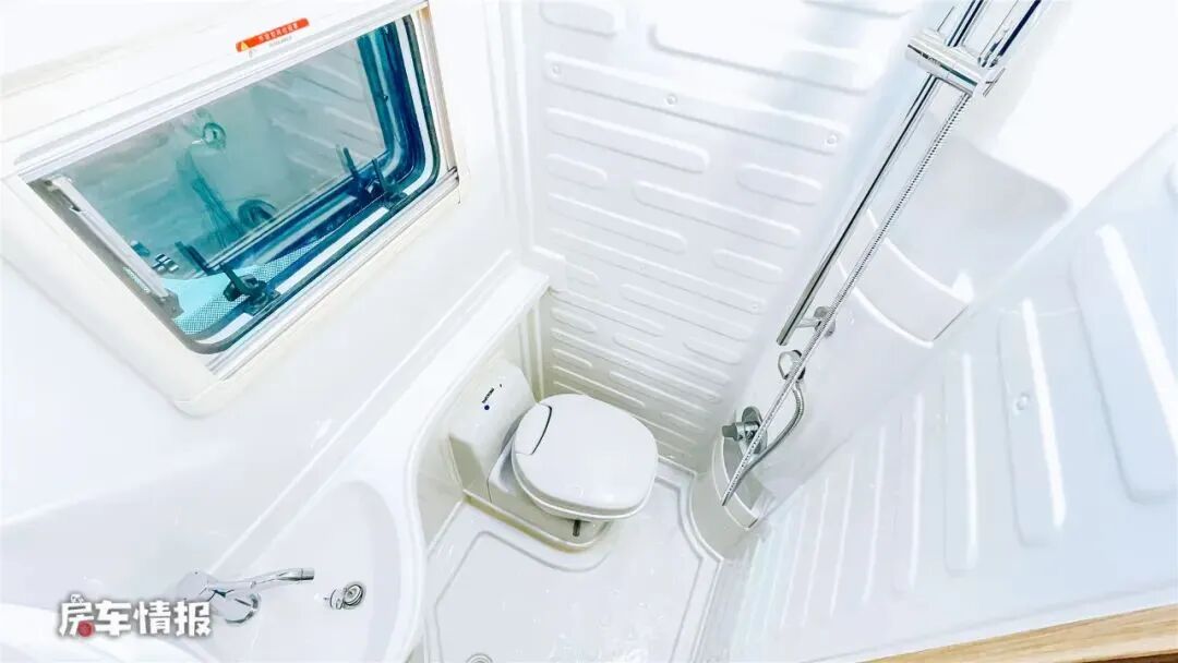 车内生活区设计简约,没有了额头床,取而代之的是一台小的液晶电视和储物空间,如果只有两个人出行,不需要太多的车内空间,可以考虑在驾驶室后方安装投影仪和幕布,这样就有了车内的私人影响,既可以坐在会客区观看,也可以躺在后面的纵置床上观看。除此之外的厨房和卫生间和同类型房车相差不大,两个人生活会显得尤为宽敞。