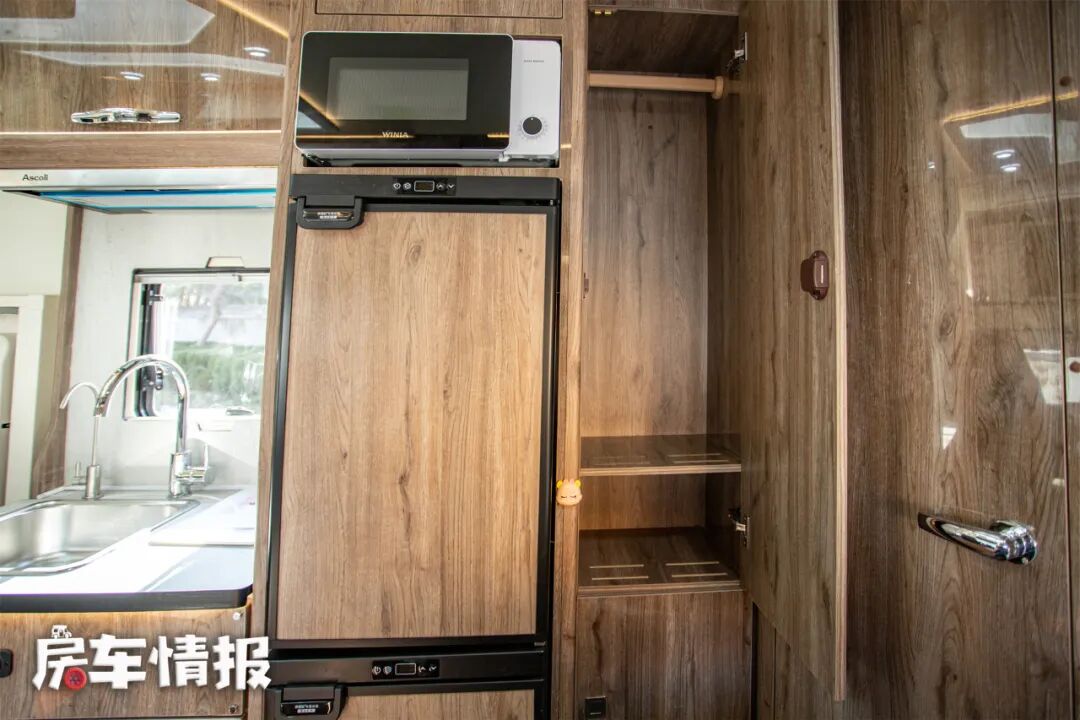在旁边的柜子里,还有一台微波炉和一台152L上下开门的冰箱,为户外出行的餐饮需求提供了更多的保障。旁边还有一个单独的衣帽间,可以挂起几件大衣,防止需要穿的时候全是褶皱。