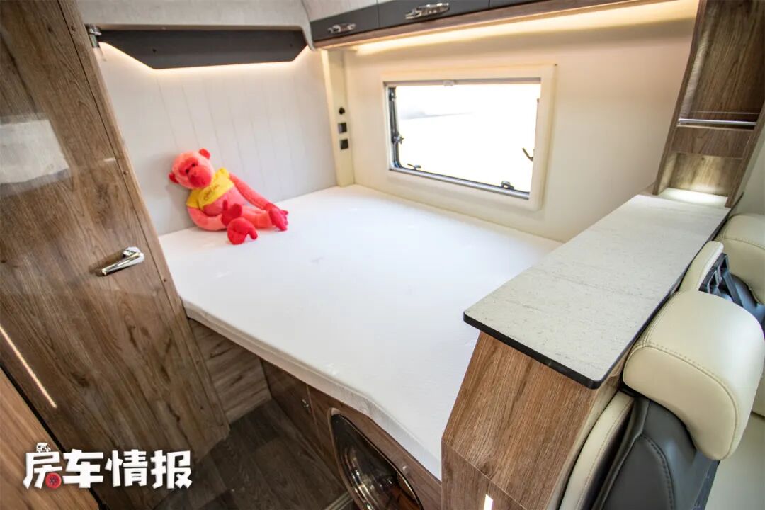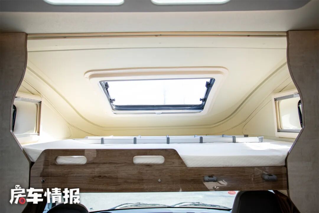 在驾驶室上方的额头内,有一张2000*1450mm的双人床,两侧各有一扇窗户,让这个小空间内不会很压抑,顶部还有一扇天窗,夜晚可以躺在这里看星星。