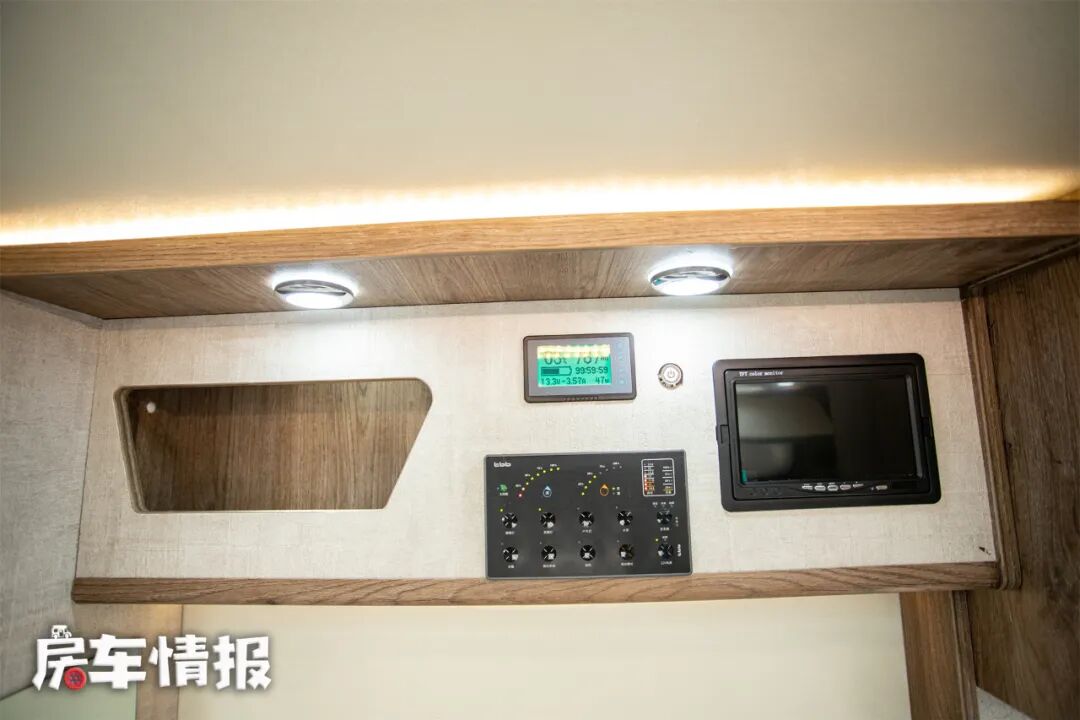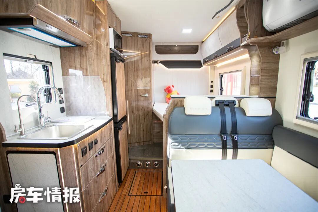 生活区内采用轻奢风格,装有木地板,面板多采用深色木纹板材,搭配多处的氛围灯和顶部的大型LED灯光,让车内有了更舒适的氛围。