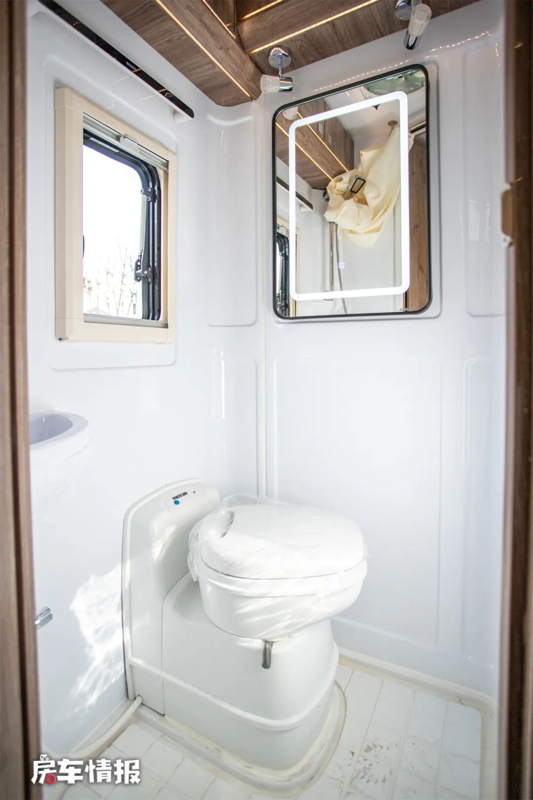 卫生间在车尾右侧,空间比较可观,一名成年人站在里面也不会拥挤。整体采用一体式吸塑设计,既能防水也能较长时间使用。装有LED背光功能的梳妆镜、盒式马桶、洗手池、淋浴花洒、置物架、暖风出风口等设备,可以满足所有的卫生需求。