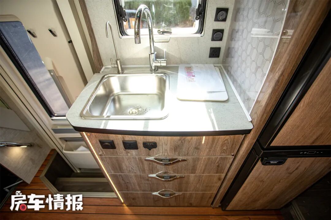 厨房在车门旁,空间不大,只有一个不锈钢洗菜池、水龙头和旁边的操作台的空间,水池旁还有直饮水接口,方便大家在户外饮水。由于本车有车外燃气灶,所以也不用担心炒菜的问题,而且在车外炒菜还能避油烟对车内的污染。如果遇到了车外天气不好的情况,车内厨房也是可以使用电磁炉的,在墙上装有电源插座,顶部还有抽拉式的抽油烟机,减小油烟的扩散。在不使用中门进出时,厨房旁边还有一个长翻板,放置一些洗好的菜还是没有问题的。