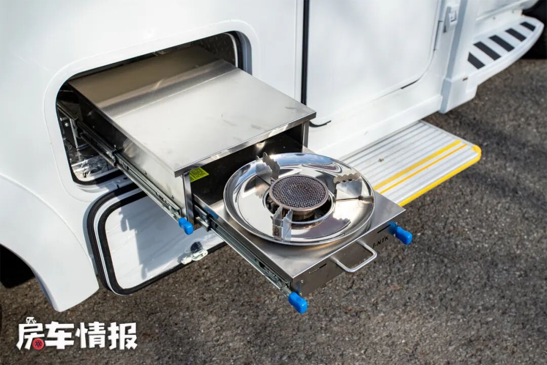在车身右侧,还有一个完备的厨房,装有抽拉式燃气灶、翻板、淋浴花洒,即可以作洗菜的水龙头使用,户外游玩回来,还可以进行简单的冲洗,避免弄脏车内环境。