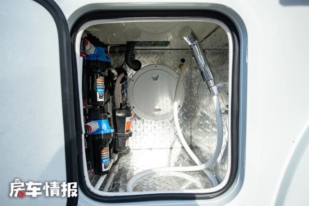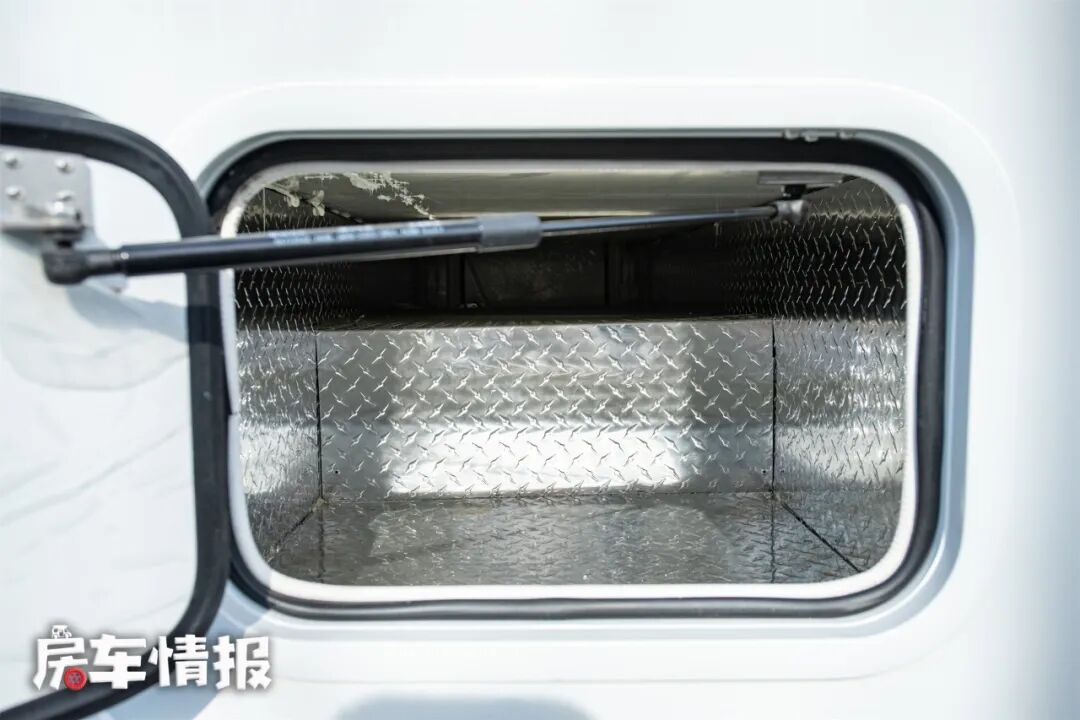 在车身左侧尾部,还有一个超大的储物空间,前方有一个小门,后方是一个大门,内部空间是贯通的,可以根据物品大小分别存放、拿取。