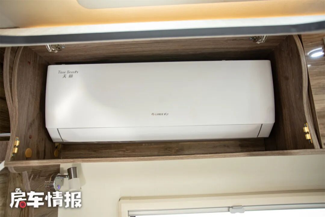 在会客区顶部,有多个储物吊柜,中间的吊柜里藏有一台家用变频空调,可以让车内尽快调节到适宜的温度。