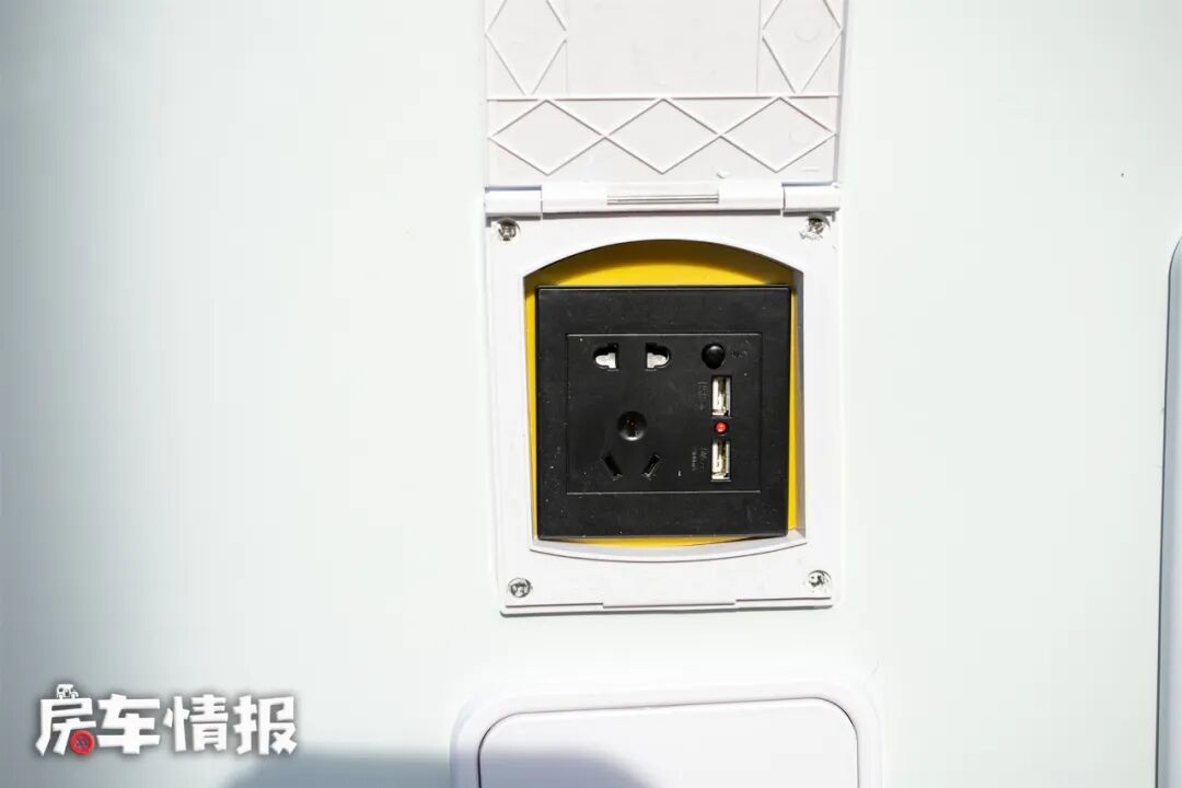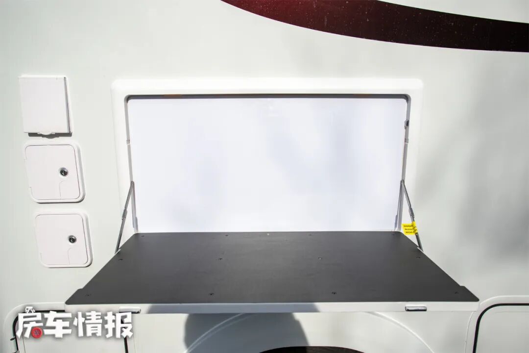 车身以白色为底,车头和侧面有酒红色装饰,让这来那个车看上去既美观又有一丝动感。流线型的额头设计,在驾驶途中可以降低风阻的干扰,提升驾驶体验。车身外侧装有多项户外生活设施,如进口菲亚马遮阳棚、照明设施、五孔电源插座、USB充电接口、水电接口等,方便了车外的生活。