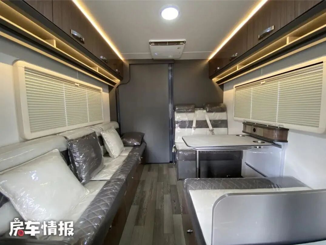 生活区内布局和其他车辆也较为不同,整车中间有一扇门隔开,分为了两部分。前半部分为休息区域,有额头床和超大的会客区,后半部分是厨房和卫生间,两边隔开的布局既能避免油烟、水雾对生活区内面板、布料的污染,还能保证大家有更好的休息空间。