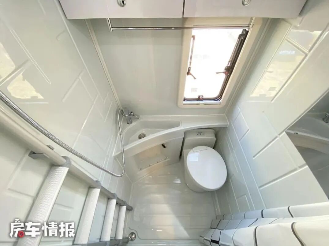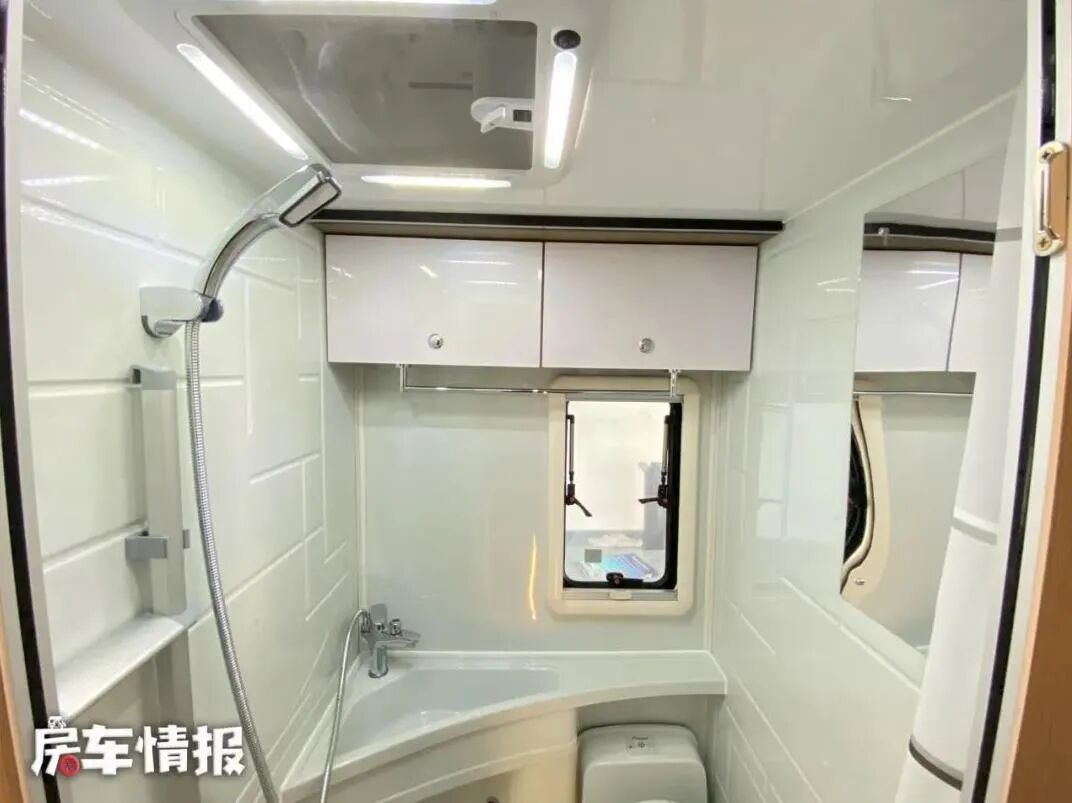 卫生间在车尾门对面,内部装有洗手池、淋浴花洒、换气扇、梳妆镜、储物吊柜,空间很大,一名成年人站在里面也可以随意走动。