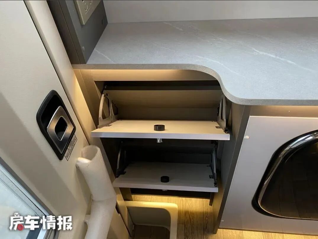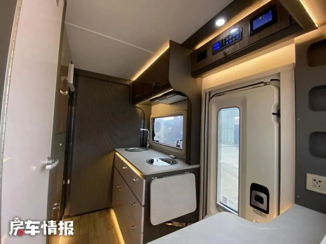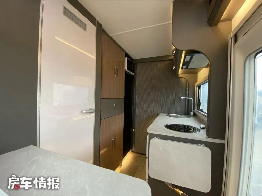 厨房在车身右侧的尾门旁,采用纵向的布局方式,甚至比同类型房车还要大。装有2500W的电磁炉、洗菜池,顶部还装有一台抽油烟机,减少了油烟的污染。旁边还有一个可翻折的小桌板,可以拓宽操作台的面积。