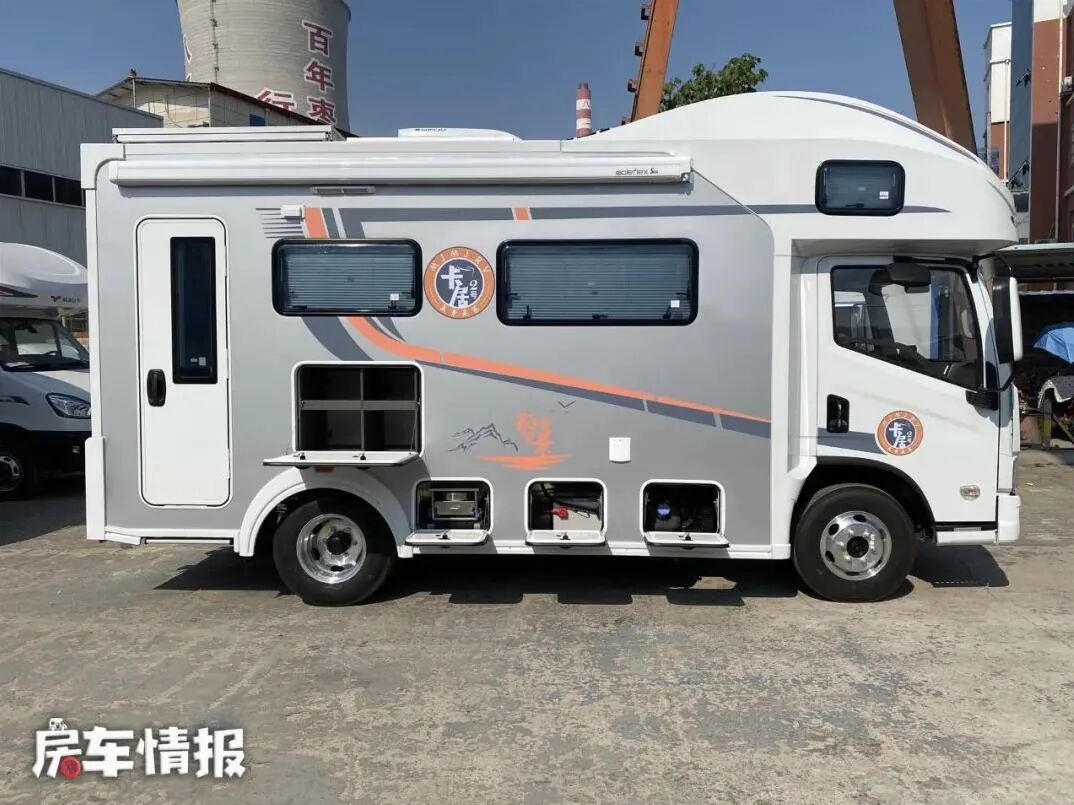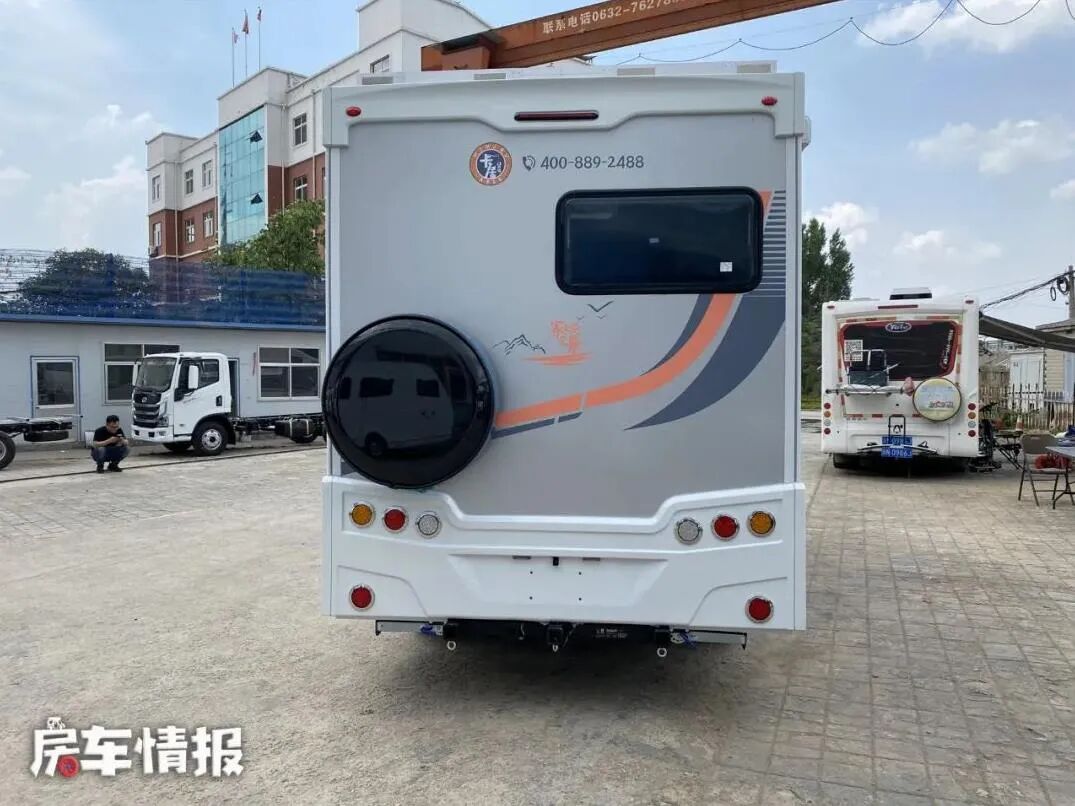 车身为灰色和白色,搭配橙色拉花和品牌logo,看上去更加动感。全车使用铝制车身,减轻了这辆大车的重量,也能省油。同时,还使用了高强度镀锌车架和保温镀锌底盘,让车辆更加牢固、更加保温。