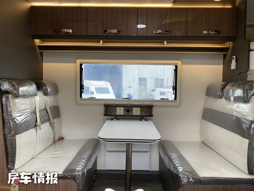 会客区的面积就很大了,左侧是一个可升降餐桌和对坐式卡座沙发,右侧是一张三人连排沙发,只有后排的对卡座沙发有安全带,行车时可以乘坐。驻车时,可以满足7人的休息,这个空间还是不可小觑的。