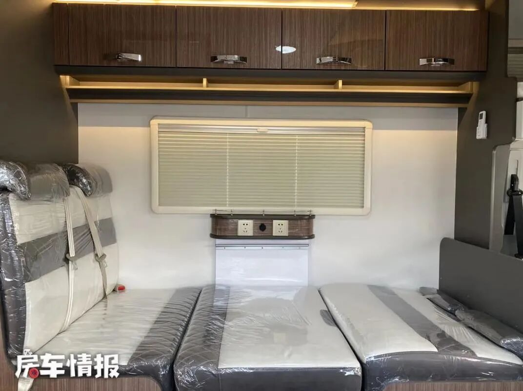 驾驶室上方是本车的额头床,有着不错的垂直高度,坐在床上也不会压抑,搭配专用的乳胶零压床垫,躺上去也很舒服。翻开部分床板,还有一台32寸的小米智能电视,在会客区休息时可以观看,为车内增加更多的乐趣。