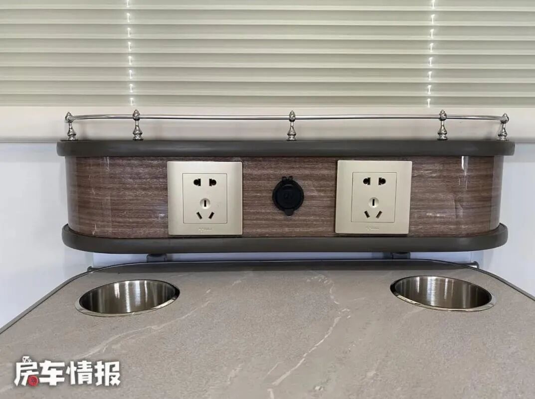 在左侧餐桌旁还装有两个五孔的电源插座,可以使用手机,或者在这里吃上一顿火锅,顶部还装有储物吊柜,可以放置出行时的行李。