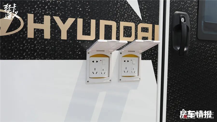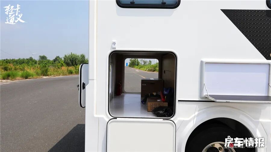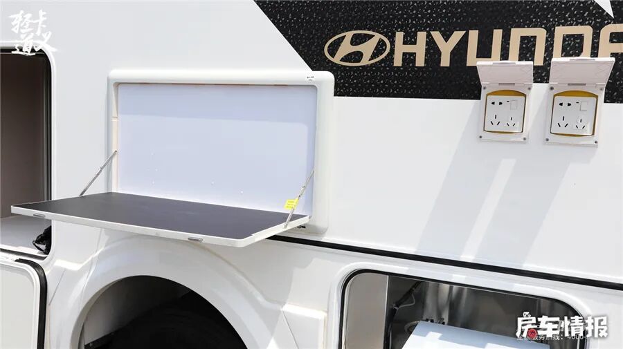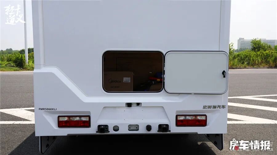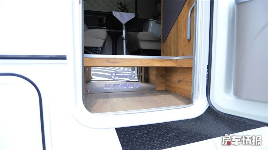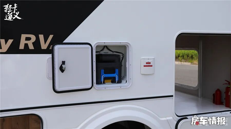 在车外还有一个十分少见也可以说是首次出现的设计,那就是加入了一个水箱检修口,当水箱使用一段时间后,需要清洁或者更换的时候,可以直接从这里进行操作,这样的设计个人觉得还是挺不错的,毕竟以往见到的房车水箱都是隐藏在车底部,普通用户想要清洁或更换是比较麻烦的一件事儿,有了这个检修口就要方便不少。