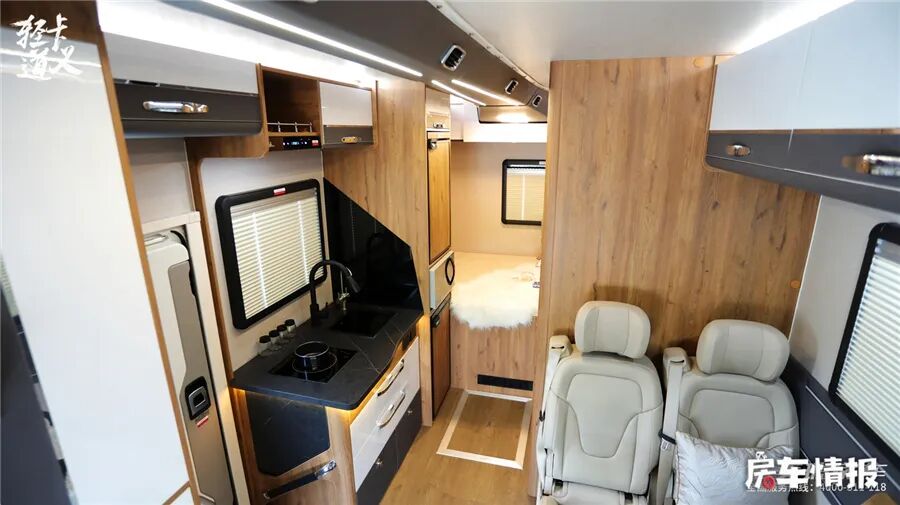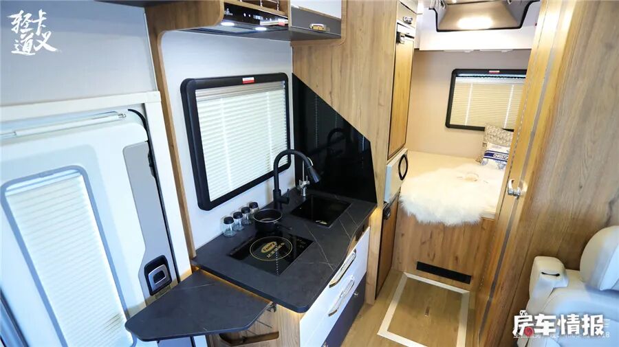 中门后方则是车内的厨房区域,提供了常用的电磁炉、洗菜池、冰箱、微波炉等设备,能够满足基本的日常使用。