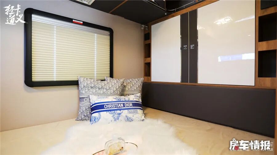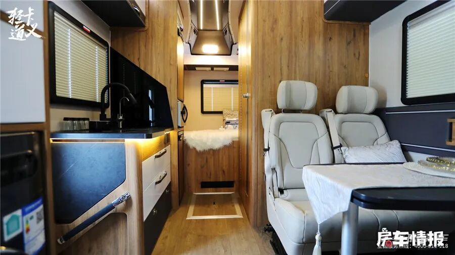 进入生活区,最直观的感受就是空间大且做工精致,你完全不会想到这是在一辆轻卡车里,原木色的家具饰板搭配深色包覆,在车辆内部营造出了不错的轻奢感。