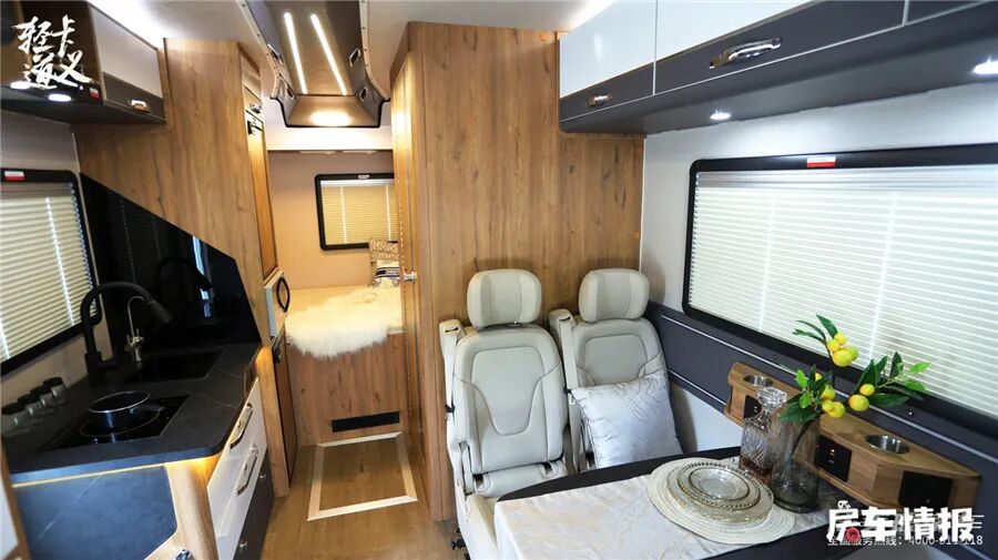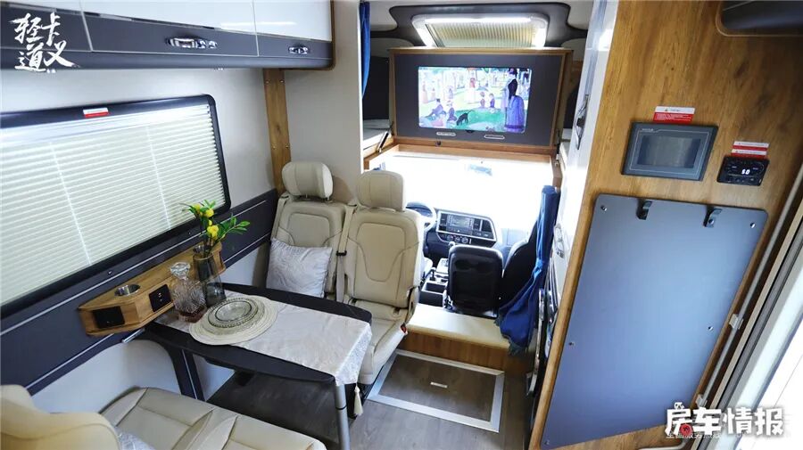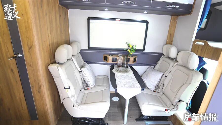 接下来是车内一些看得见的设计。客厅会客区采用主流的四人对座设计,为了获得更好的乘坐舒适性,这里换装了四个独立乘用车座椅,靠背角度和坐垫前后都能进行调节,大大地提升了长途乘坐的舒适性;即便换成了乘用车座椅,但这里依然可以拼成一张尺寸约为2000*1000mm的单人床。