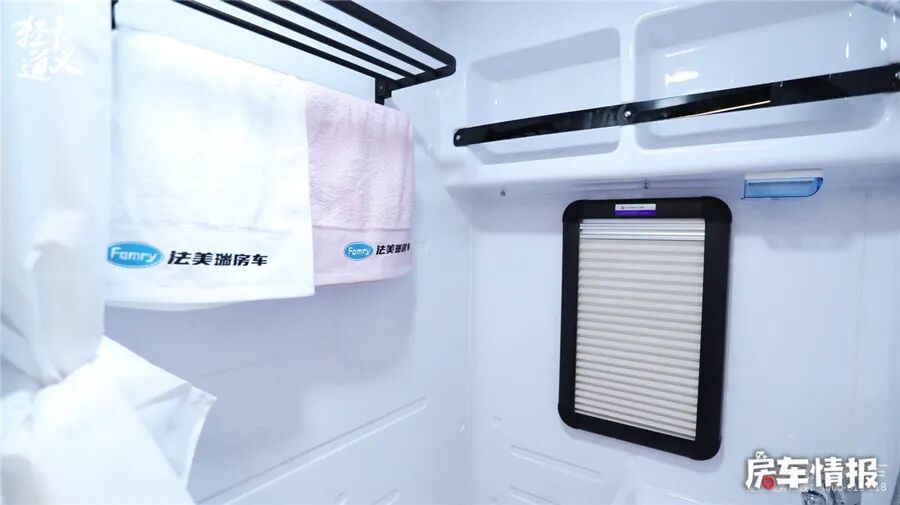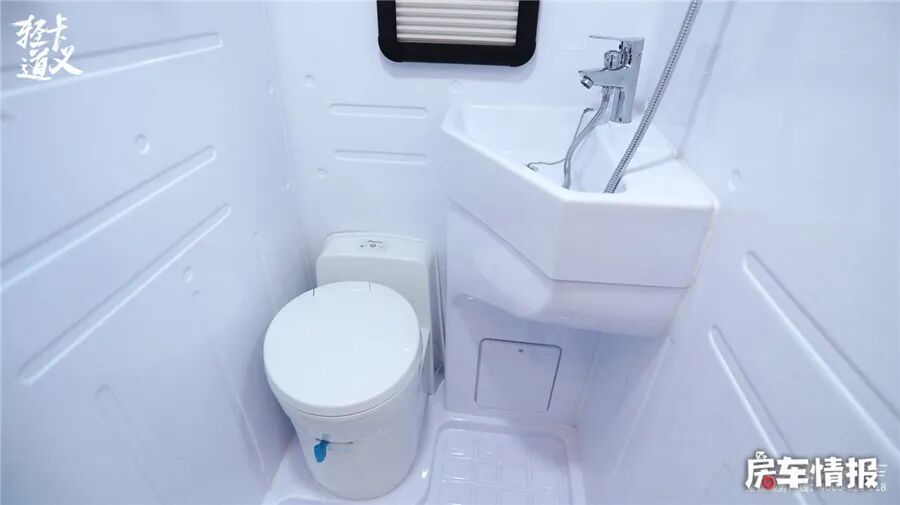 车内卫生间内部空间也挺不错,提供了盒式马桶、独立淋浴花洒、洗手池、换气扇等,搭配上那套地暖系统,即便是到了冬天也能在车里洗个热水澡。